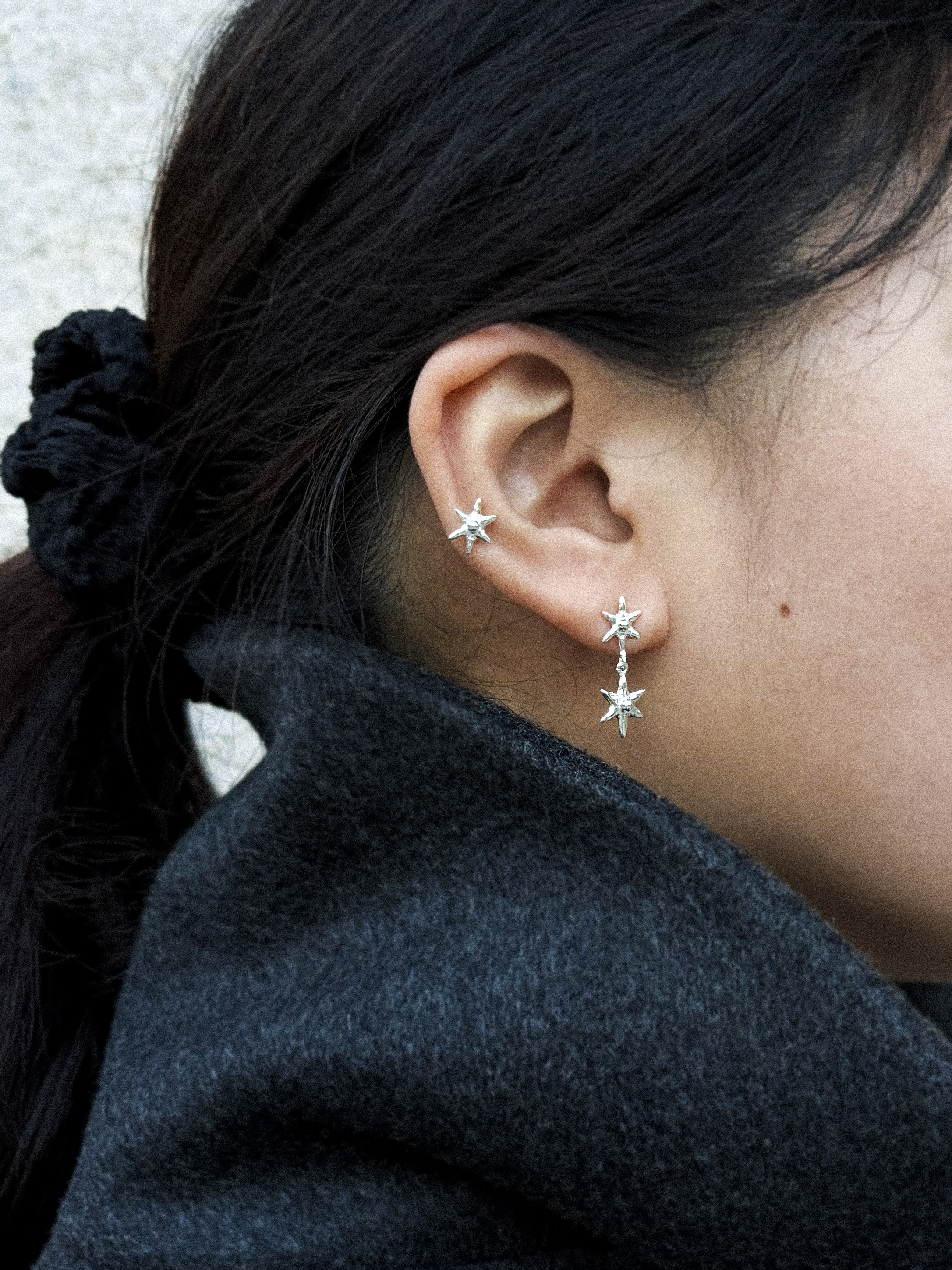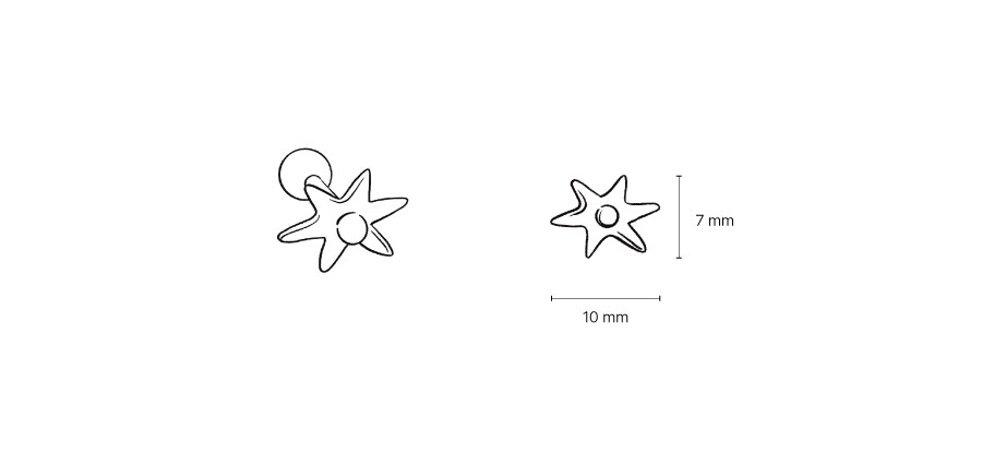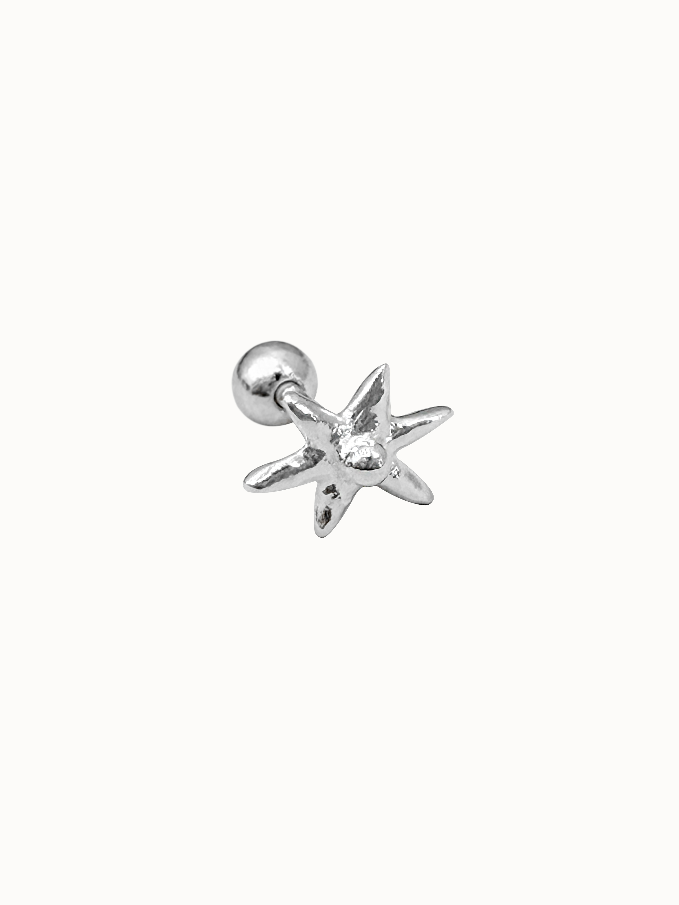 작은 별 조각이 마치 밤하늘에서 밝은 점으로 빛나는 것처럼 귓가에서 반짝이는 느낌의 피어싱 입니다. 작지만 존재감이 있어 포인트가 되어주며, 착용할 때 별 조각의 방향을 어디로 향하도록 두는지에 따라 미묘하게 다른 느낌을 줍니다..