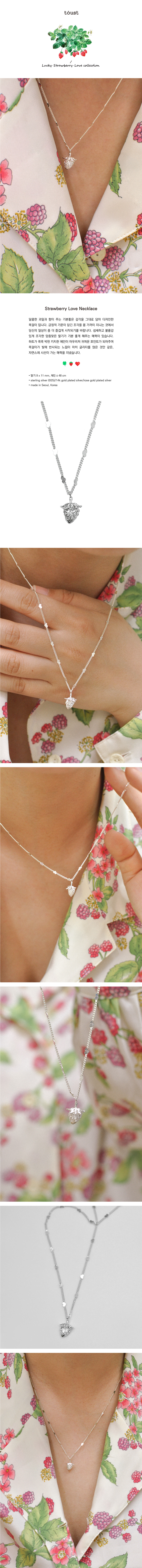 달콤한 과일과 향이 주는 기분좋은 감각을 그대로 담아 디자인한 목걸이 입니다. 긍정적 기운이 담긴 조각을 몸 가까이 지니는 것에서 당신의 일상이 좀 더 즐겁게 시작되기를 바랍니다. 섬세하고 볼륨감 있게 조각한 앙증맞은 딸기가 기분 좋게 해주는 매력이 있습니다. 하트가 콕콕 박힌 키치한 체인이 어우러져 귀여운 포인트가 되어주며 목걸이가 빛에 반사되는 느낌이 마치 글리터를 얹은 것만 같은, 자연스레 시선이 가는 매력을 지녔습니다.
