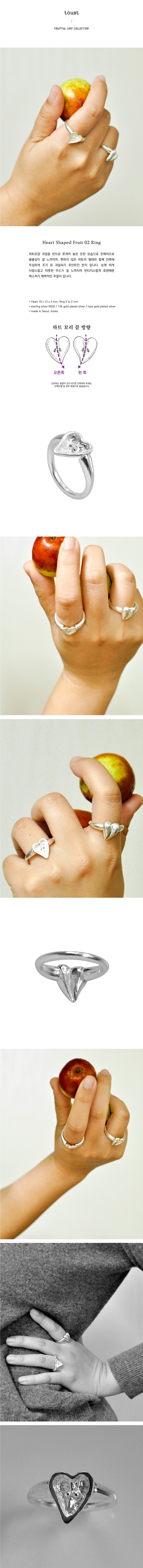 하트모양 과일을 반으로 쪼개어 놓은 듯한 모습으로 전체적으로 볼륨감이 잘 느껴지며, 뻔하지 않은 하트의 형태와 함께 안쪽에 무심하게 조각 된 과일씨가 포인트인 반지 입니다. 눈에 띄게 사랑스럽고 따뜻한 무드가 잘 느껴지며 빈티지스럽게 표현해본 텍스쳐가 매력적인 주얼리 입니다.