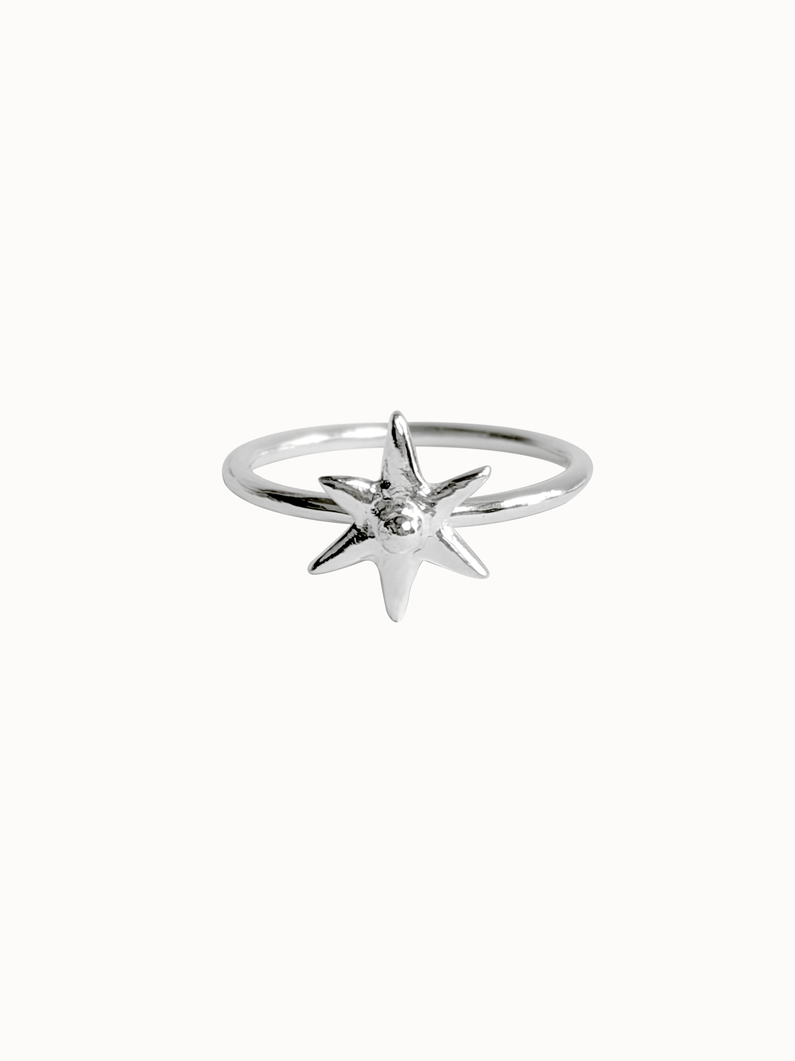 큰 별이 손가락 위로 빛나고 있는 듯한 느낌을 주는 반지 입니다. 얇은 링 라인 위로 별이 얹어져 있는 디자인으로 우아하면서도 확실하게 포인트가 됩니다. 살짝 앤티크한 고전적인 느낌도 있어 오래도록 착용하여도 질리지 않는 매력이 있습니다.